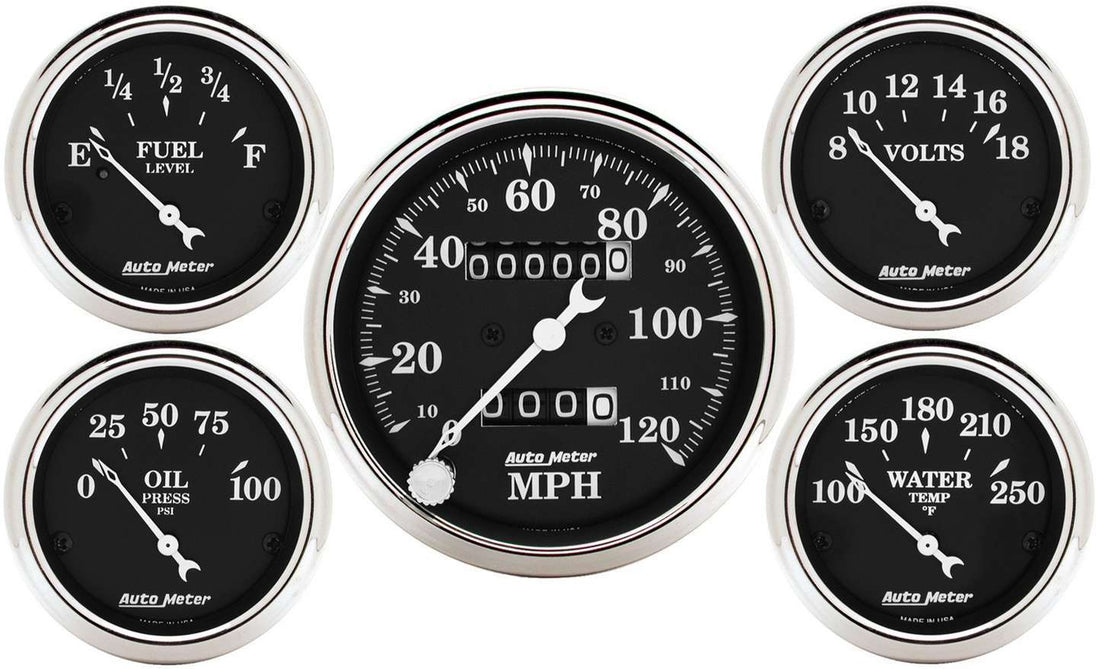 Upgrade your vehicle's dashboard with the AUTOMETER 1708 O/T/B 5-Piece Gauge Kit, featuring a classic old tyme black design. This comprehensive kit includes essential gauges for fuel level, oil pressure, voltmeter, water temperature, and speedometer, ensuring you have all the critical information at a glance. Each gauge is designed with a sleek black face that complements any interior, providing both functionality and a touch of vintage style.