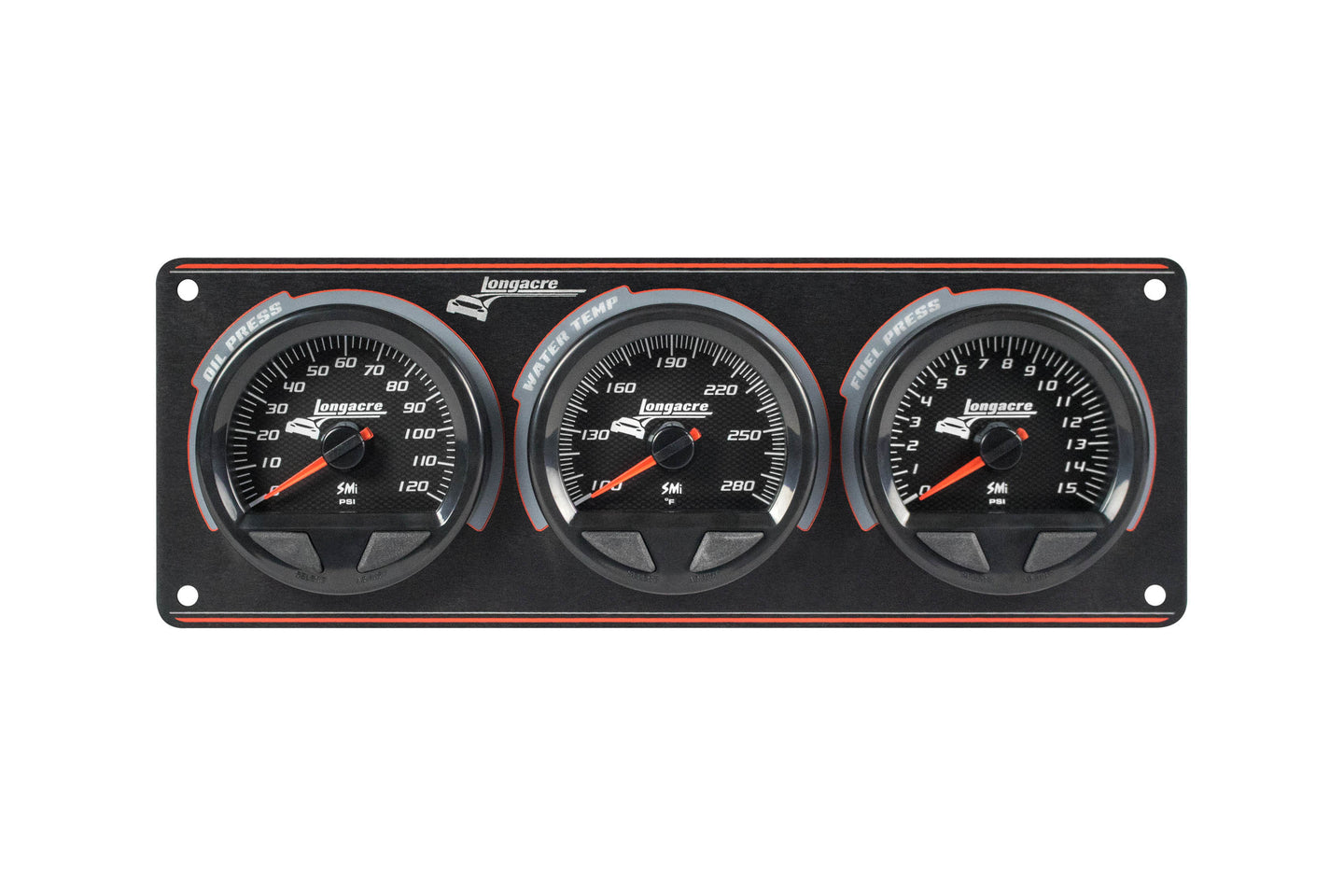 Introducing the LONGACRE 52-44562 Waterproof SMI 3 Gauge Panel, designed for performance enthusiasts who demand precision and reliability. This versatile gauge panel features three essential gauges: Oil Pressure, Water Temperature, and Fuel Pressure, all housed in a sleek black face. With a diameter of 2-5/8 inches, it's perfect for fitting into your vehicle's dashboard while providing clear visibility during your drive.