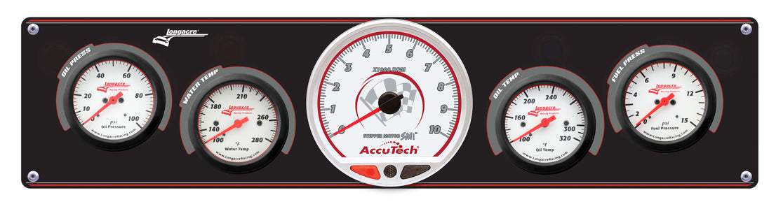 Enhance your vehicle's performance tracking with the LONGACRE 52-46910 Gauge Panel Sportsman. This comprehensive gauge panel assembly features an analog tachometer, fuel pressure gauge, oil pressure gauge, oil temperature gauge, and water temperature gauge, all designed for precision monitoring. The elegant white face ensures excellent readability under various lighting conditions, making it a perfect addition to your race car or high-performance vehicle.