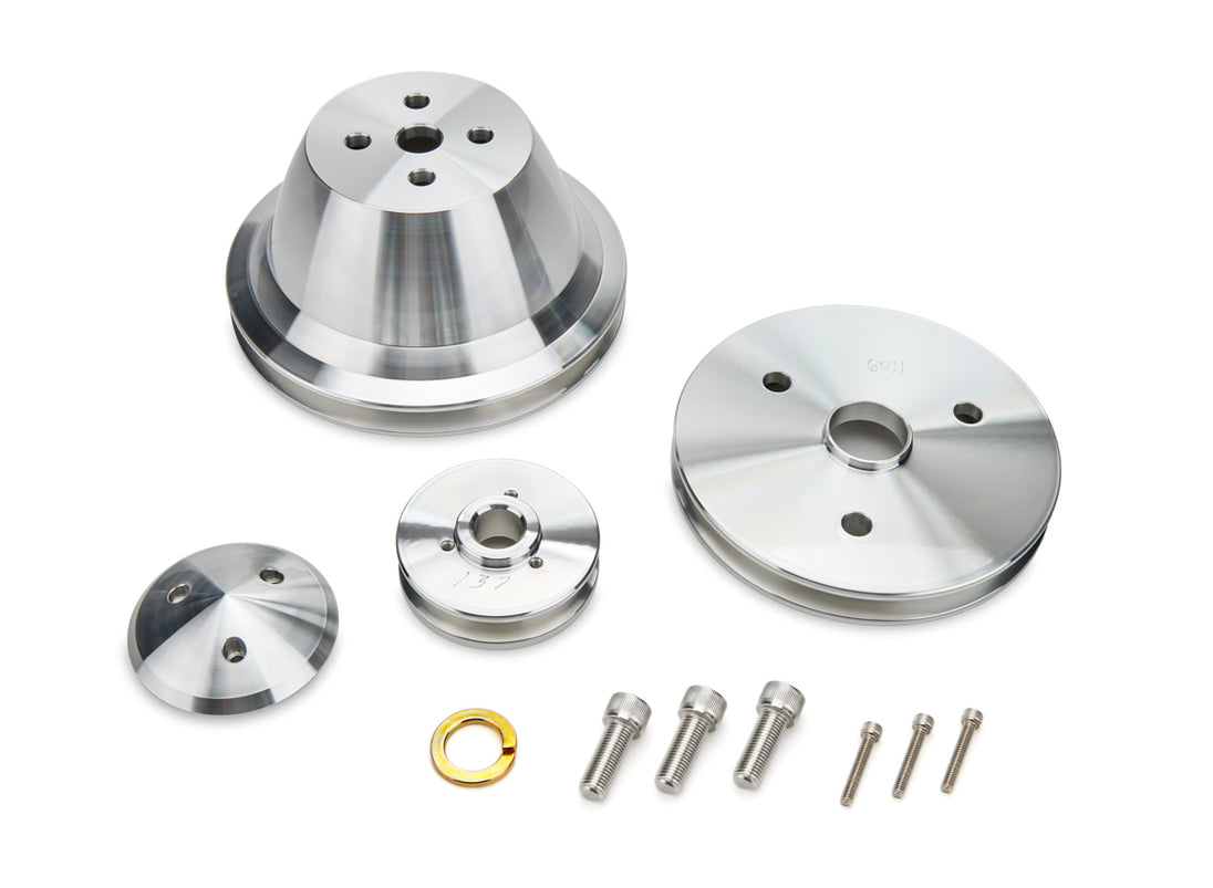 SB Chevy Pulley Set Pulley Kit - Performance Ratio - 1 Groove V-Belt - Aluminum - Clear Powder Coat - Short Water Pump - Small Block Chevy - Kit