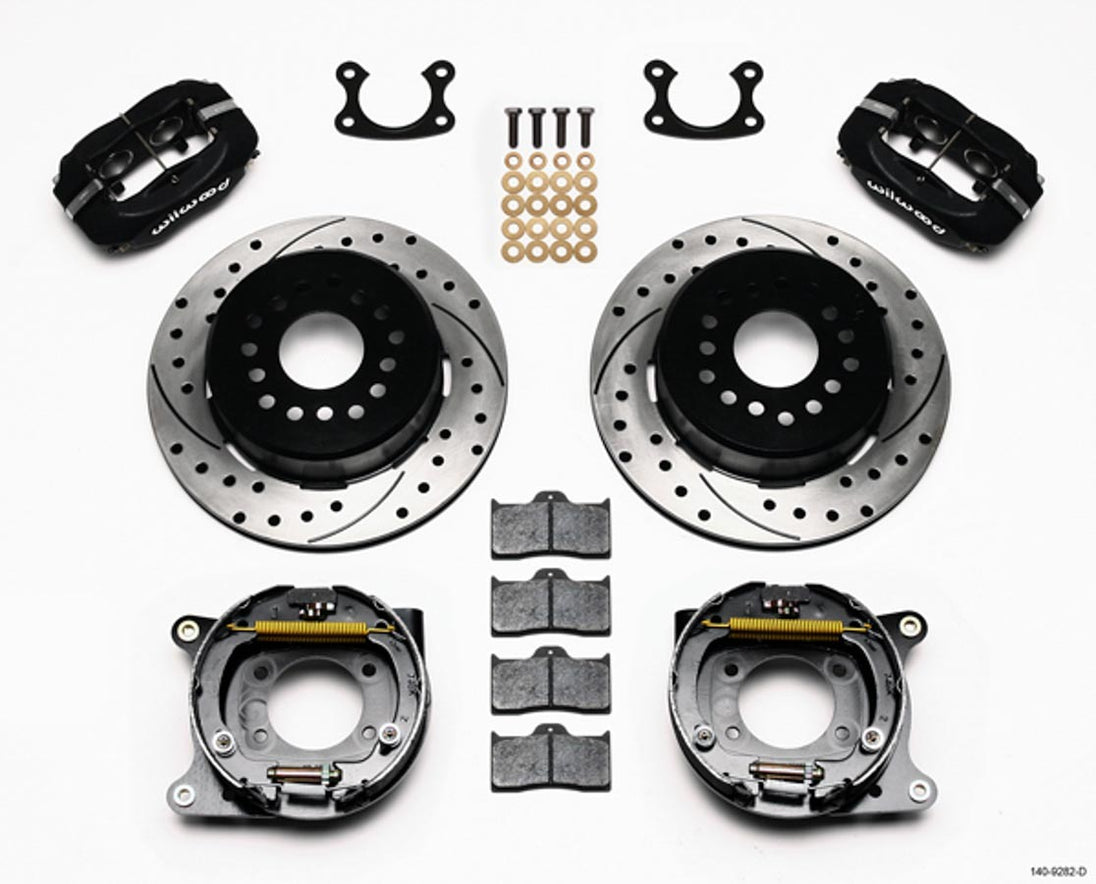 Brake System - Dynalite - Rear - 4 Piston Caliper - 12.000 in Drilled / Slotted Iron Rotor - Offset Hat / Parking Brake - Aluminum - Black Powder Coat - Small Ford - Kit