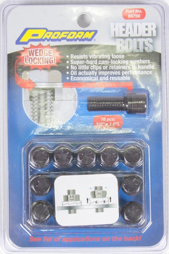 Wedge Locking Header Bolts 3/8in x 1in 16pcs. Header Bolt - Locking - 3/8-16 in Thread - 1 in Long - Hex Head - Steel - Black Oxide - Chevy V8 - Set of 16Regular price $37.95 -