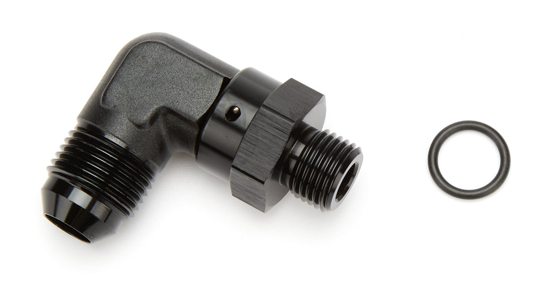 Fitting 90 degree Male -8AN to Male Straight Fitting - Adapter - 90 Degree - 8 AN Male to 6 AN Male O-Ring Swivel - Aluminum - Black Anodized - Each