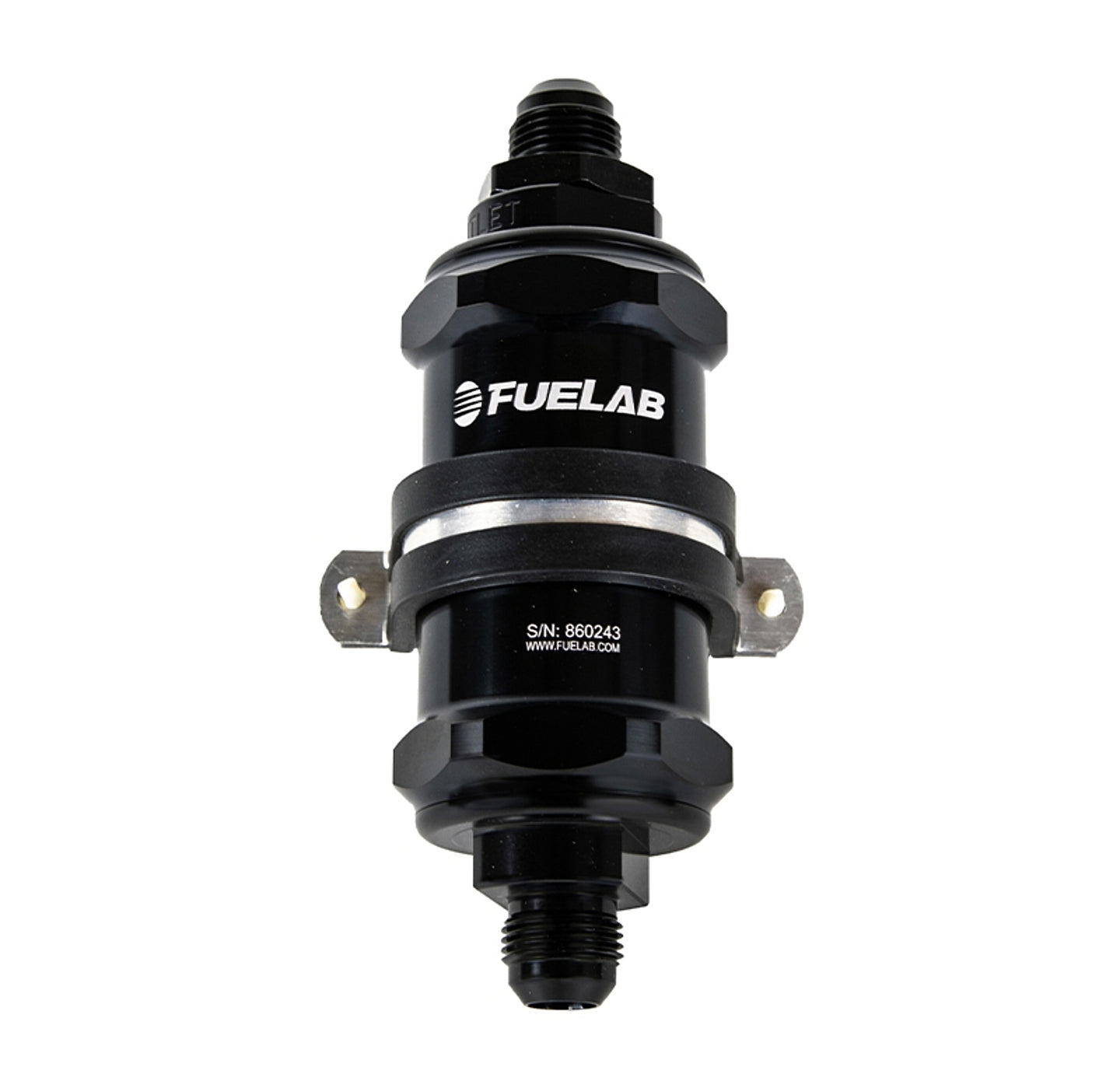 Fuel Filter - In-Line - 6 Micron - 3 in Microglass Element - 8 AN Male Inlet - 8 AN Male Outlet - Integrated Check Valve - Aluminum - Black Anodized - Each