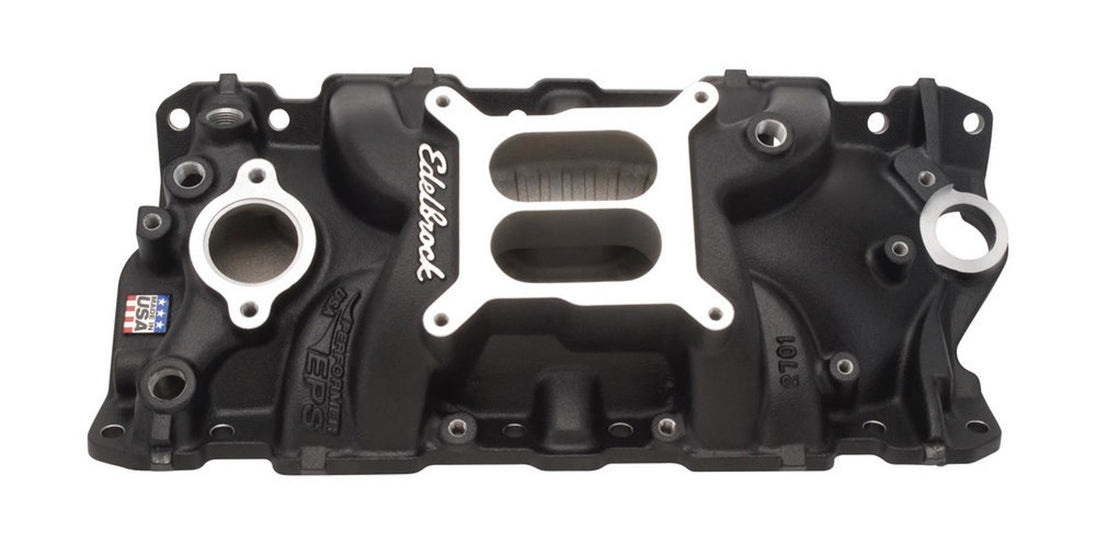 SBC Performer EPS Manifold - Black Intake Manifold - Performer EPS - Square Bore - Dual Plane - Aluminum - Black Powder Coat - Small Block Chevy - Each