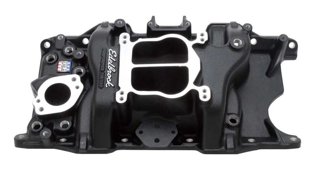 SBM Performer Manifold - 318/360 - Black Intake Manifold - Performer 318/360 - Spread / Square Bore - Dual Plane - Aluminum - Black Powder Coat - Small Block Mopar - Each