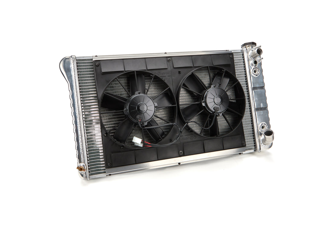 Radiator and Fan - Direct Fit - 30.25 in W x 18.625 in H x 3.25 in D - Dual Pass - Passenger Side Inlet - Passenger Side Outlet - Aluminum - Polished - GM LS-Series - GM Fullsize Truck 1967-72 - Kit