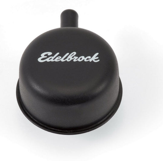 Vendor: EDELBROCK Round Cap w/Nipple Black Round Cap w/Nipple Black Breather - Push-In - Signature Series - Round - 1-1/4 in Hole - 3/8 in Hose Barb Fitting - Edelbrock Logo - Steel - Black Powder Coat - EachRegular price $18.95