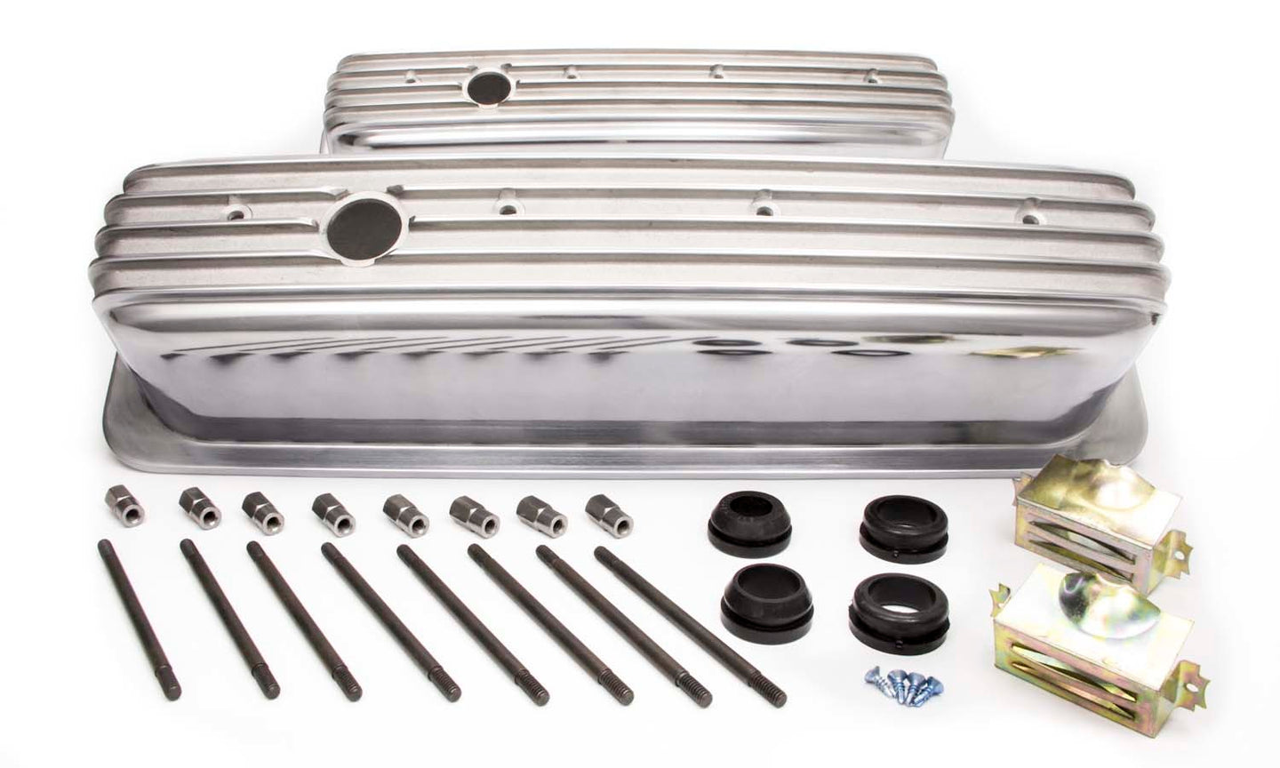 Valve Cover - Tall - 3.688 in Height - Finned - Baffled - Breather Holes - Hardware Included - Aluminum - Polished - Center Bolt - Small Block Chevy - Pair