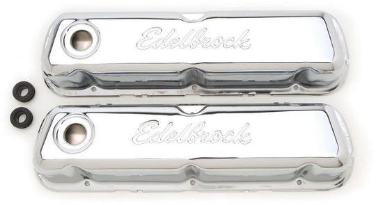 SBC Signature Series Valve Cove Set - Chrome Valve Cover - Signature Series - Short - Baffled - Breather Hole - Grommets - Edelbrock Logo - Steel - Chrome - Center Bolt - Small Block Chevy...Regular price $114.95