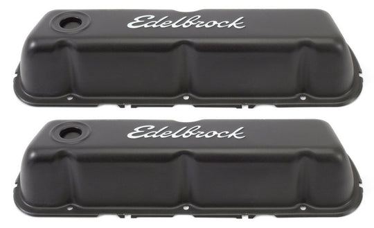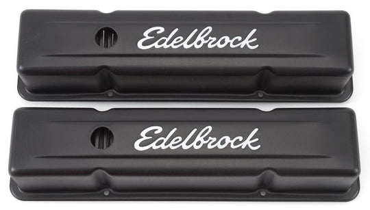 SBC Signature Series V/C's - Black Valve Cover - Signature Series - Short - Baffled - Breather Hole - Grommets - Edelbrock Logo - Steel - Black Powder Coat - Small Block Chevy - PairRegular price $59.95 -