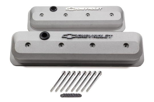 SBC Valve Cover Slant Edge Gray Crinkle Valve Cover - Slant-Edge - Tall - Baffled - Breather Hole - Raised Polished Chevrolet Logo - Aluminum - Gray Crinkle Powder Coat - Small Block Chevy - PairRegular price $317.95