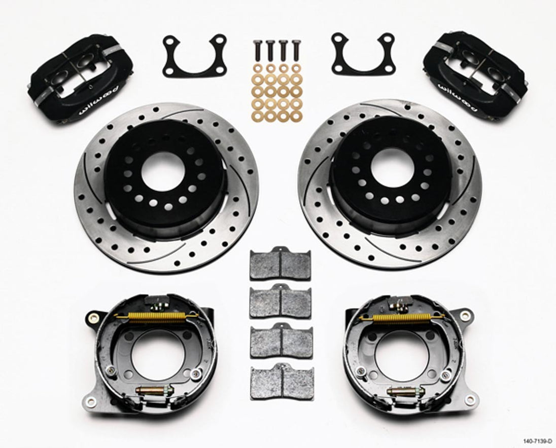 Brake System - Dynalite - Rear - 4 Piston Caliper - 12.000 in Drilled / Slotted Iron Rotor - Offset Hat / Parking Brake - Aluminum - Black Powder Coat - Big Ford - Kit